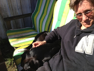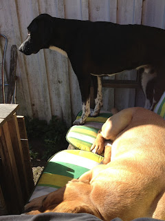 En helt underbar morgon. Strålande sol och en lähörna där vi placerade oss, jag och hundarna, en stund när vi hade dumpat lilleman på ett frukostkalas. Hugo hade intagit positionen närmast matte. Här kommer nu en instruktion i hur man helt utan att det liksom märks kör bort kompisen och övertar den bästa platsen.