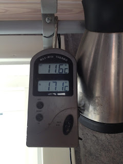 Förhoppningsvis ska vi slippa frysa ihjäl. Första natten säger i o f s inte så mycket om hur det blir framöver men i morse var det i alla fall inte så farligt kallt inne.