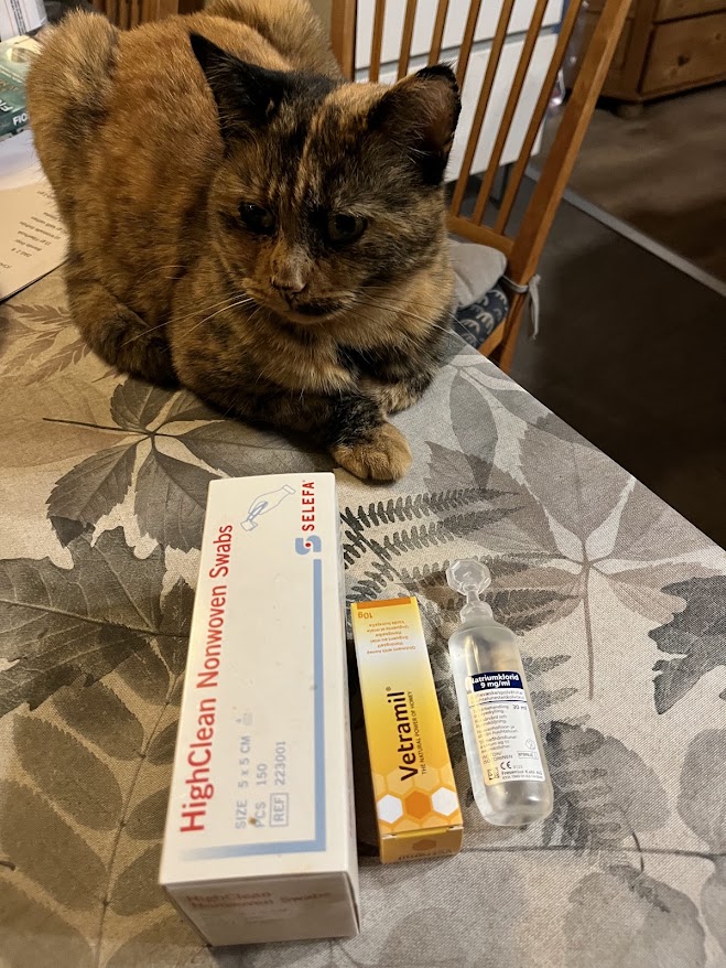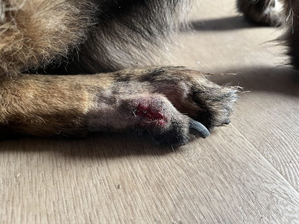 I morse var det återbesök för Ruth hos veterinären efter att hon tuggade bort stygnen för fyra dagar sen efter operationen där en utväxt på tassen togs bort. Såret ser fint ut och läkeprocessen går framåt. Nu ska såret tvättas/sköljas med koksalt och sen medicinsk honung på en till två gånger per dag. Ruth var så duktig hos veterinären och charmade både veterinär och djurvårdare. Inget schäferpipande där inte. Utväxten var godartad. Det var typ hårceller som hade börjat växa okontrollerat. Kirurgen hade fått bort alls så nu ska bara såret läka så är vi tillbaka till vardagen igen. Tills det är läkt är det tratt som gäller.