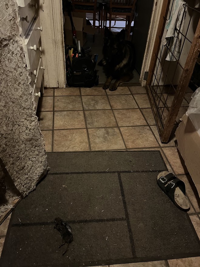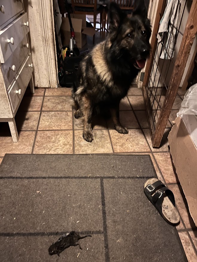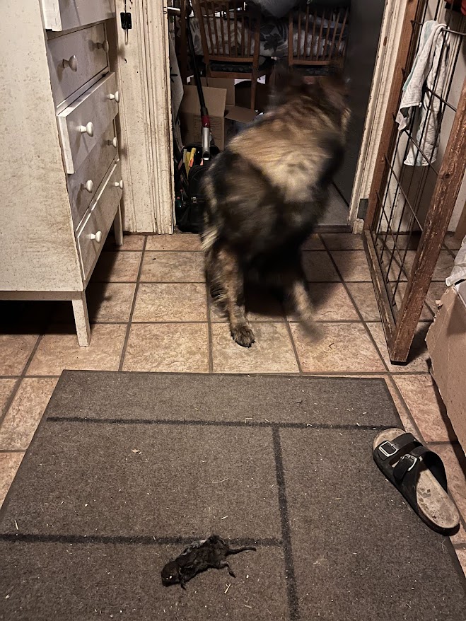 Har suttit och lyssnat på en intressant föreläsning, Immunförsvar för framtiden med fokus hund från SKK. Det kom en katt springandes förbi och sen var det lite livat i köket. På rasten blev det klart varför. Ruth hade stulit en vattensork från katterna och har sen haft fullt schå att vakta sitt stulna byte från katterna.