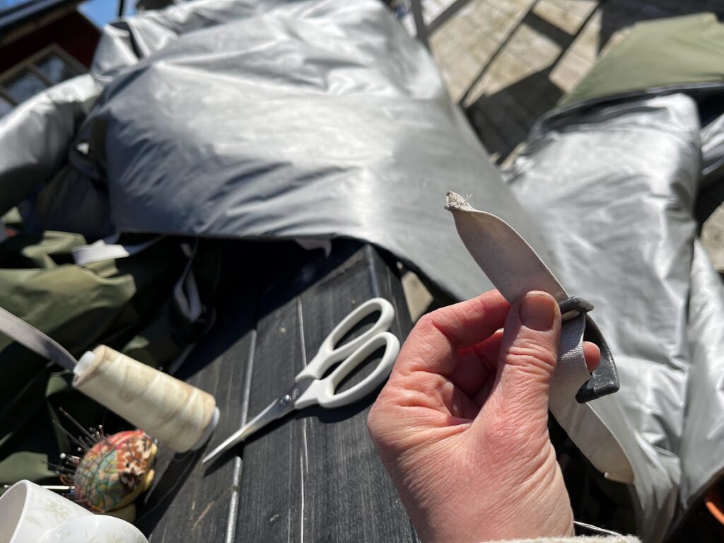 De hade varit lite snåla på några av fästremmarna på MASA-täcket och jag hade lyckats slarva bort några av fästena. Kontaktade leverantören och de skickade raskt nya fästen och förlängningsremmar. Knöt fast förlängningarna och satte på de saknade fästena. Funderade på hur jag ska undvika att fästena fortsatt lossnar och försvinner. Sydde ihop ändarna på remmarna. Nu borde det i alla fall vara betydligt svårare att de lossnar. Behöver fästena bytas, om de går sönder, är det bara att sprätta upp igen. Nu kommer täcket sitta som ett smäck igen.
