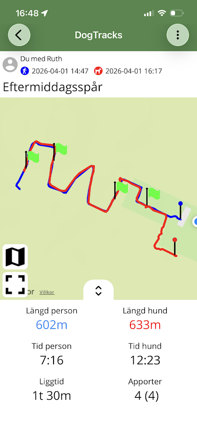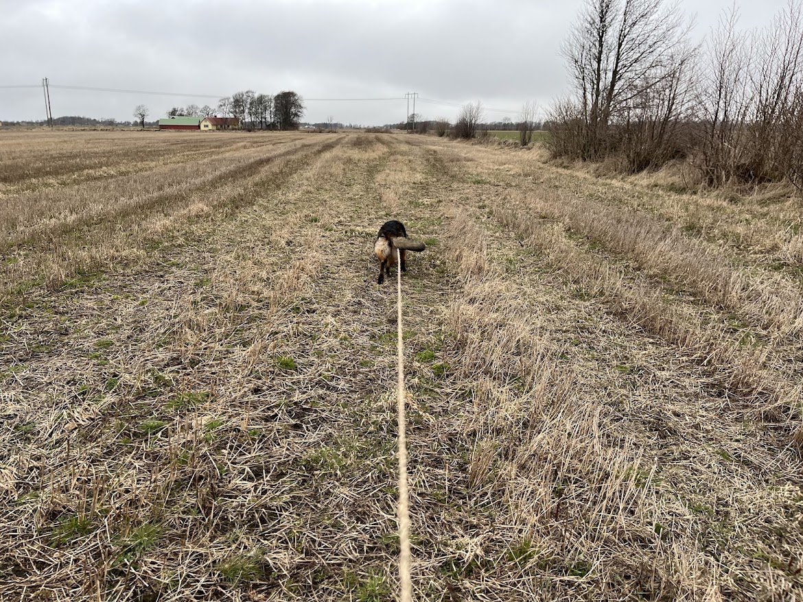 Det är ju väldigt praktiskt när det finns en åker att spåra på utan att ens behöva ta sig hemifrån. Vi får passa på före åkern ska jobba igen. Ruth blir alldeles till sig när hon förstår att det är spår på G. Idag körde vi patrull med spårupptag. Hon jobbar finfint även fast det går i 190 knyck. Fyra apporter av typen man tager vad man råkar hitta i hallen, en trasig träslev, en metallbult modell större, en gammal arbetshandske och sist en bollvariant. Så här glada är vi när vi har spårat klart.
