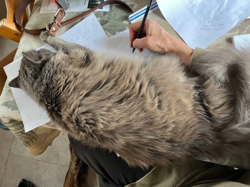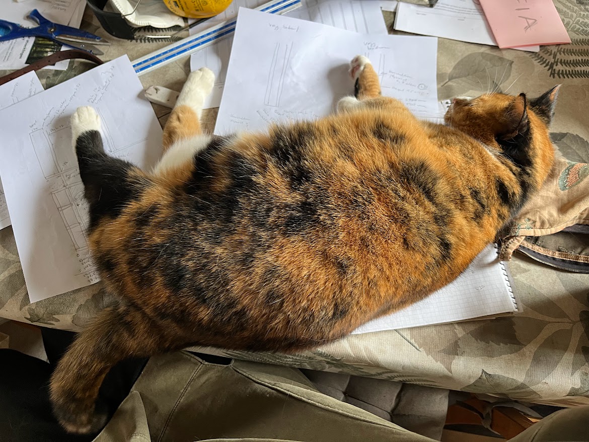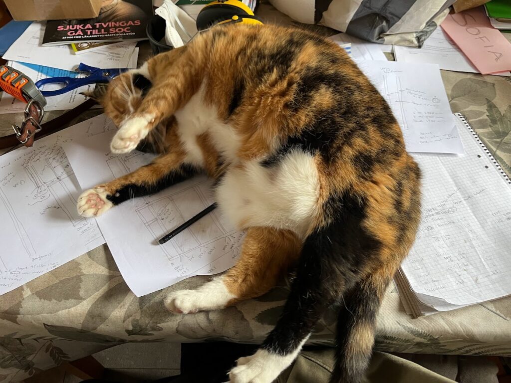 Har försökt sitta med ritningarna för bjälklaget till tiny houset. Det går så där, ganska hopplöst till och med. Är det inte den ena katten som lägger sig pladask över det matten håller på med så är det den andre eller tredje. Felix och Halvan kom med på bild. Citrus fastnade inte. Det är med livet som insats att försöka flytta på dem.