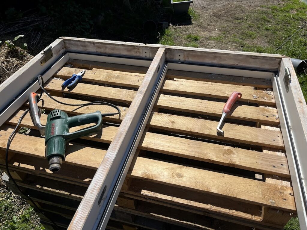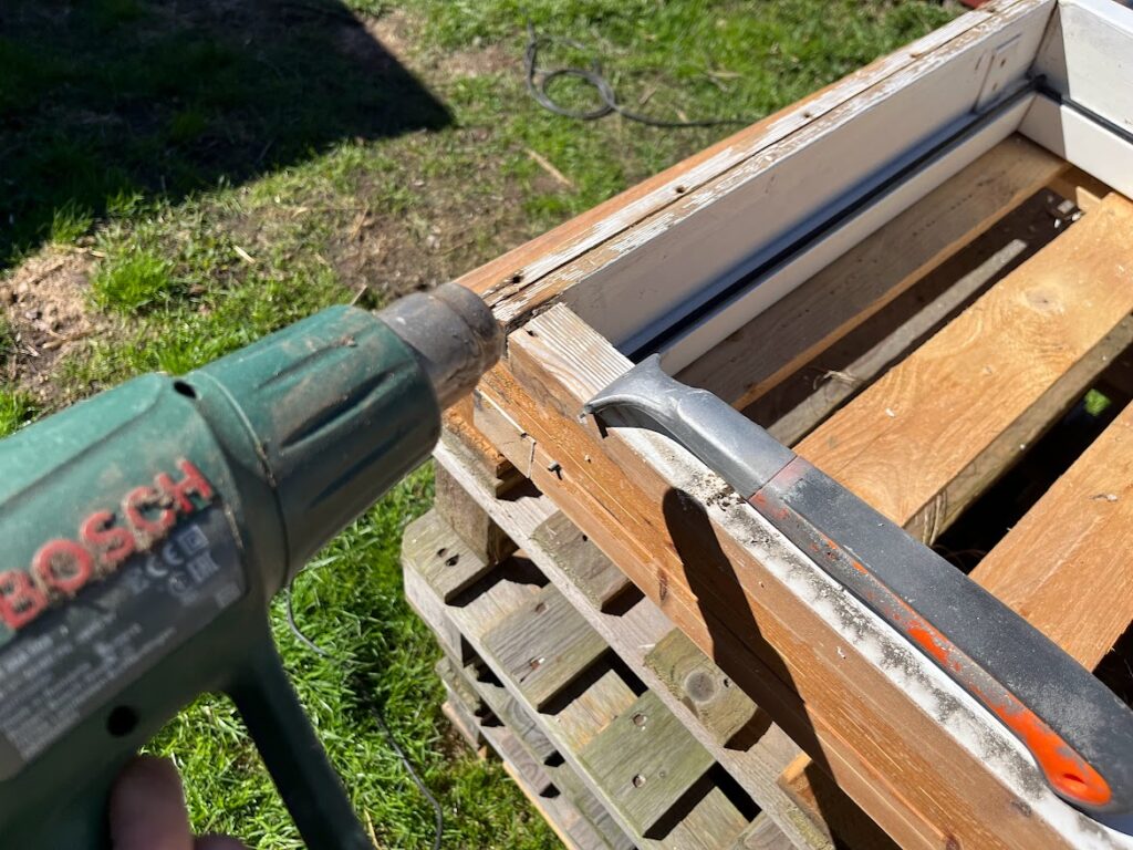 Plötsligt händer det, idag tog jag tag i det fortsatta skrapandet av de tre gigantiska fönstren, 12×24, till tíny houset. Började skrapa inne i vintras men fick information om att det inte är bra att köra värmepistol och skrapa fönster inne då plastfärgerna avger giftiga ångor. Så då stannade arbetet upp och jag kom helt av mig. Men, idag har det skrapats som bara den. Det första fönstret är klart och det andra är typ halvklart. Hoppas att det fina vårvädret håller i sig så att arbetet kan flyta på.