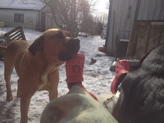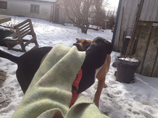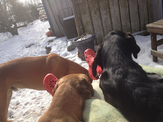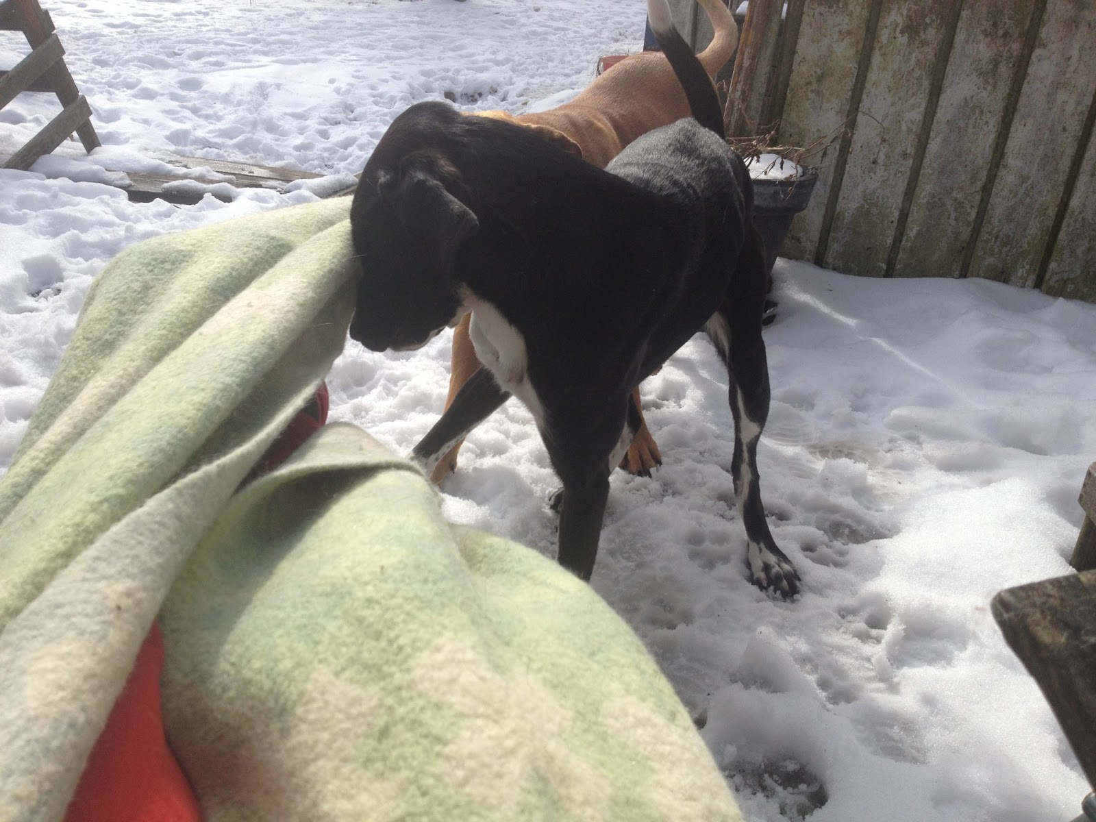 Hundarna var av en helt annan åsikt om hur tiden skulle spenderas… de kämpade hårt för att dra igång matte. Framför allt Hugo så klart men de andra hejade glatt på och fungerade som uppviglare. Hugo tog ett stadigt tag i filten och drog i väg med mig i solstolen…