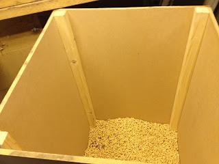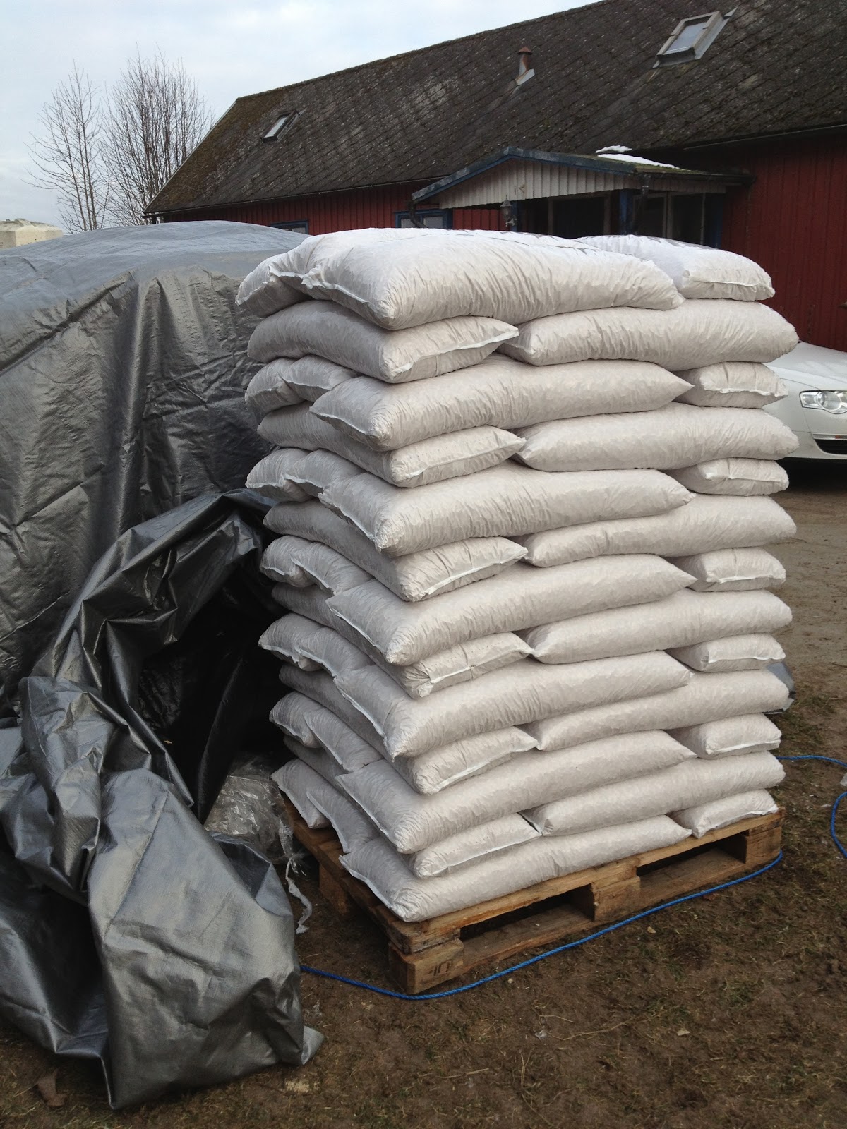 Alla säckarna inne… pust! Det där med feber och kroppsarbete är inte att rekommendera, var helt slut när jag var färdig. Trångt blir det när en hel pall ska få plats där i pannrummet…