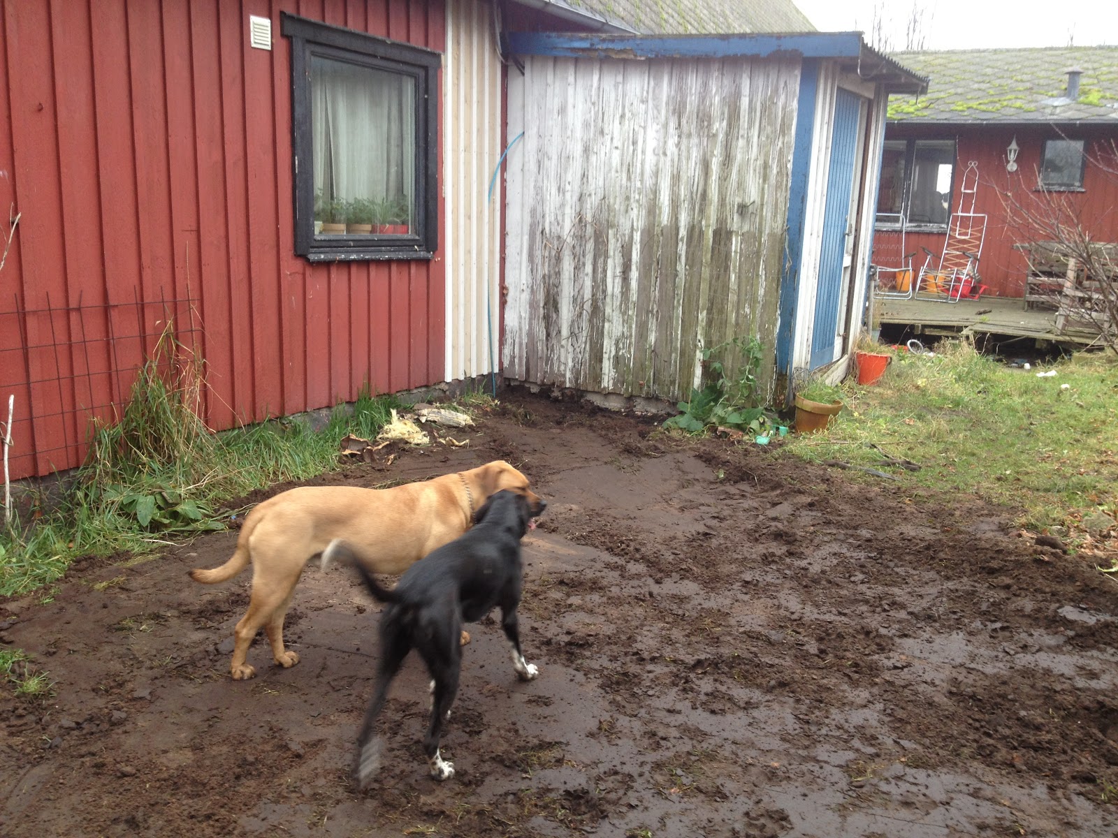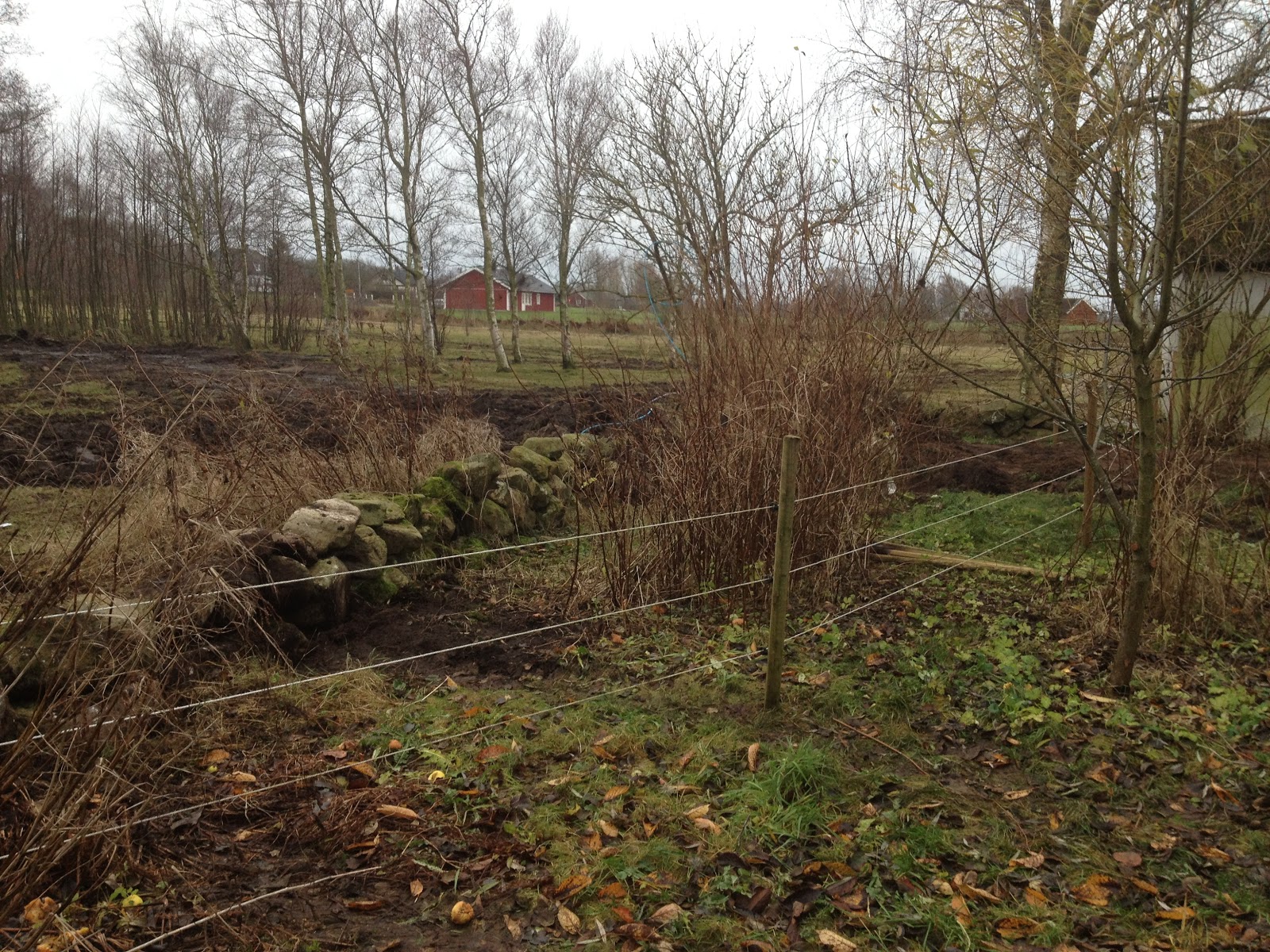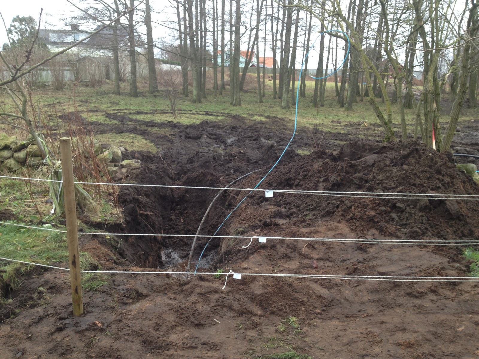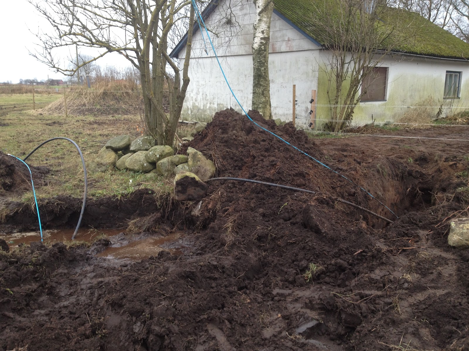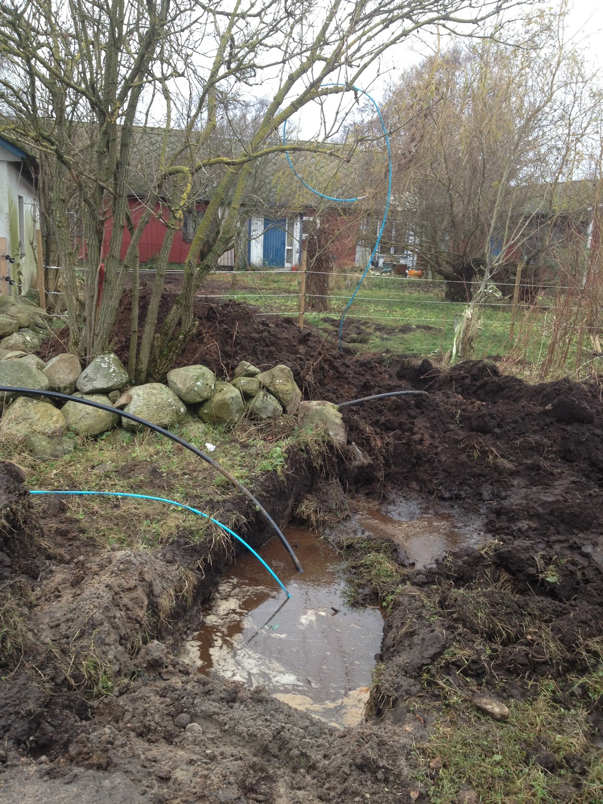 Då var det grävt från stammen till tomtgräns och från huset till tomtgräns. Då återstår för entreprenören att koppla ihop slangarna. Det kommer förmodligen att dröja ett tag så jag hoppas att inte Hugo får för sig att tugga slang… nu ligger slangarna utanför elinhägnaden så det ska förhoppningsvis gå vägen.