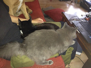 Ubbe Snubbe låg och sov i knät i godan ro. Då kom syrran, Felix, och liksom knödde in från sidan. Först lite försynt vid sidan, sen när hon knött på ett tag…