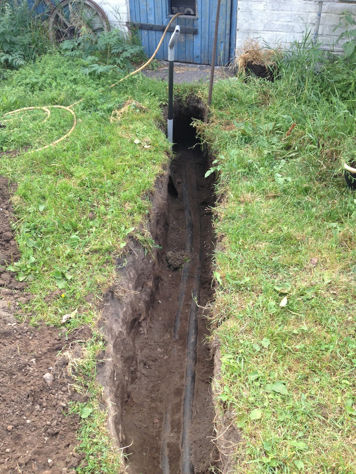 Efter vila kommer arbete… Gav mig på sista biten grävning. Kan meddela att jag var rätt mör redan när jag började. Sen att jag stod och kastade massorna bakom mig för att ha yta att passera på utan att behöva klampa över jordhögen gjorde inte saken bättre… MEN nu är det klart! Blev 29 m…