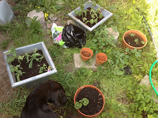 Sju tobaksplantor och den söta petunian fick flytta över i zinkkrukorna. Förbarmade mig över några av de stackars pelargonerna som jag bara slängde ut i våras för att se om de skulle ta sig. Har förträngt dem sen dess…