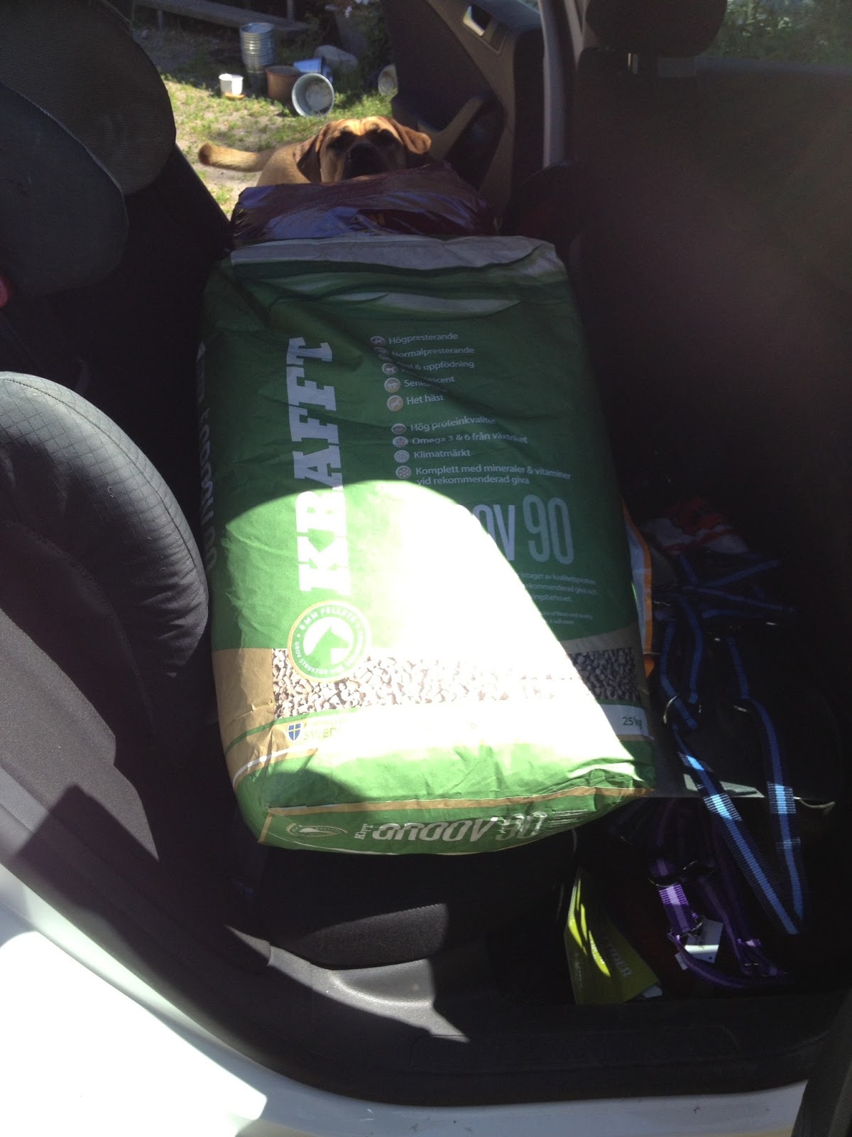 Blev en tur till Granngården för nu var det så äckligt i ena boxen så nu var det tvunget att köpa spån för att kunna mocka ur ordentligt. Var visst lite rea där och en del annat som också behövde handlas… blev inte ett helt gratis besök. Hästmat, hundmat, kattmat och jag fick ett par nya gummistövlar med stålhätta.