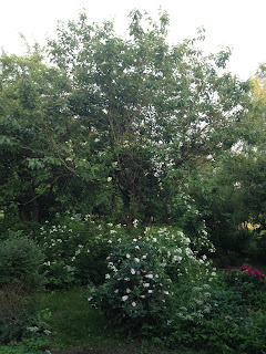 Honungsrosen är hel fantastisk. Den är helt galen, växer och växer. Är nästan ända uppe i toppen av det japanska körsbärsträdet.
